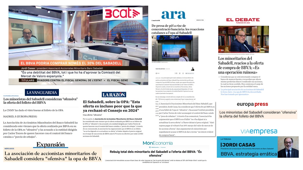 La Asociación ha denunciado en prensa escrita, online, TV y radio que la propuesta de BBVA infravalora a Banco Sabadell en un 10% respecto a su cotización de mercado, traslada más impuestos a los minoritarios y plantea una rebaja en la política de dividendos, al tiempo que pretende controlar la entidad con tan solo un 30% del capital.